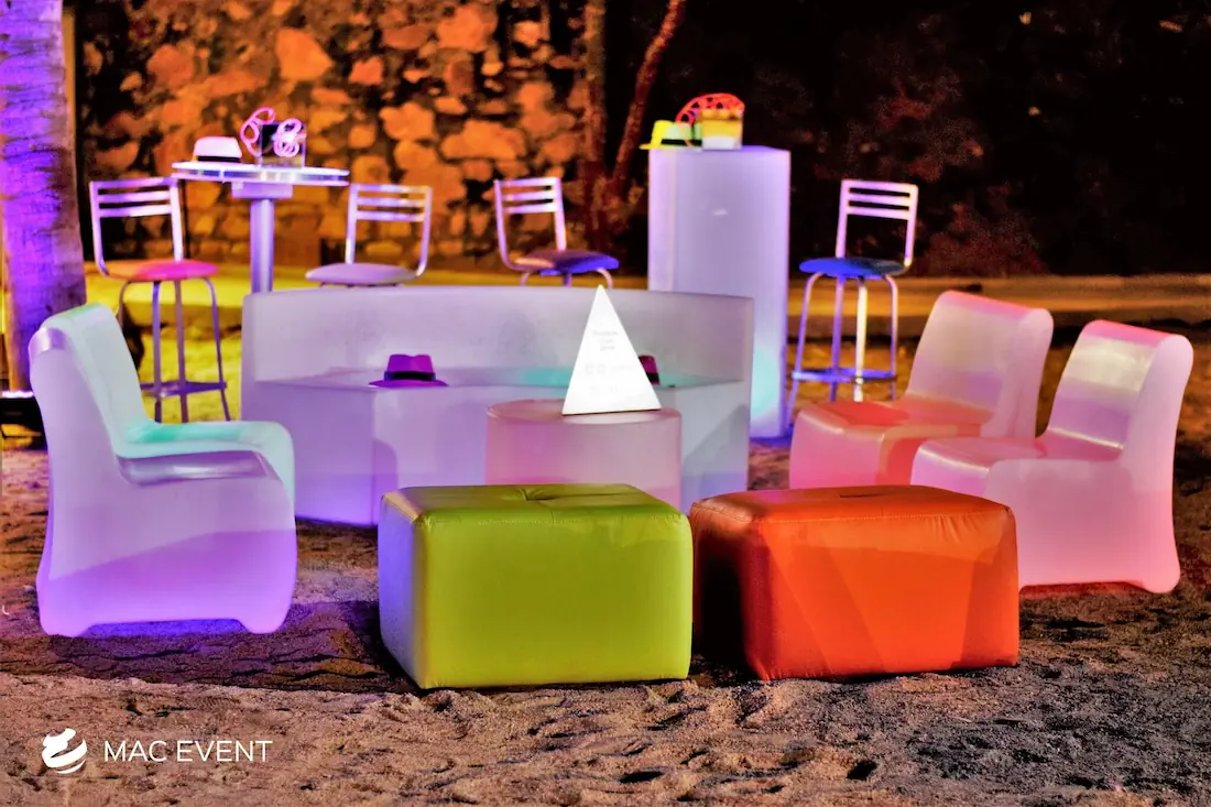 The illuminated lounge adds a vibrant and contemporary touch to weddings, parties, and corporate events in Destiladeras. Featuring furniture with built-in LED lighting, this event lounge rental creates a dynamic atmosphere that transforms from day to night. Perfect for beach receptions, evening parties, or modern corporate gatherings, the illuminated lounge enhances your décor with colorful accents and a sleek glow. Renting illuminated lounges in Destiladeras allows you to design lively, photo-worthy spaces that impress guests and elevate your event experience. For a bold and memorable setup, the illuminated lounge is the perfect centerpiece.